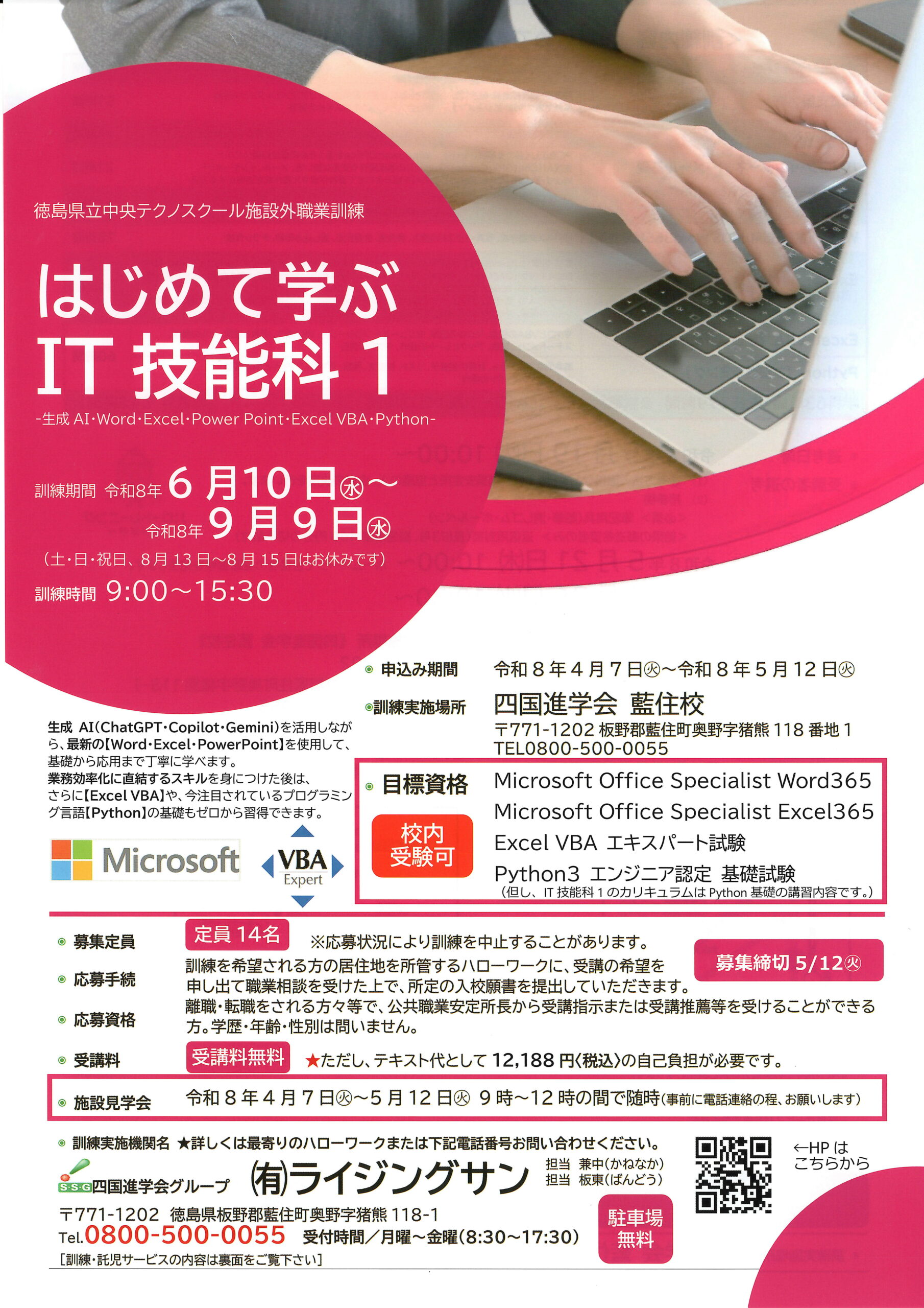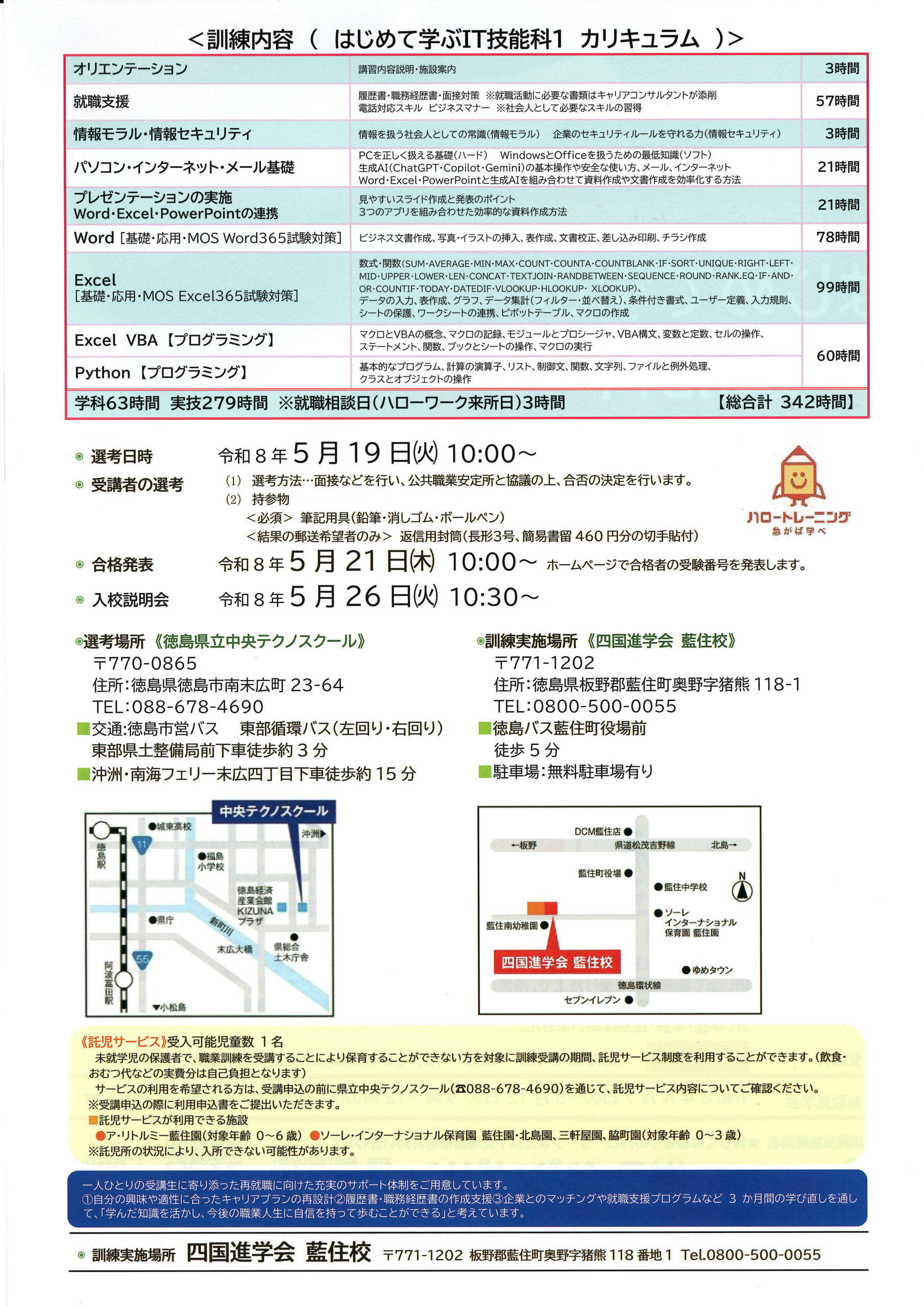 令和8年度 公共職業訓練「IT技能科1(令和8年6月開講、藍住校)